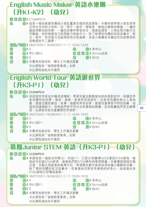 暑期Junior STEM 英語(升K3-P1)(幼兒)