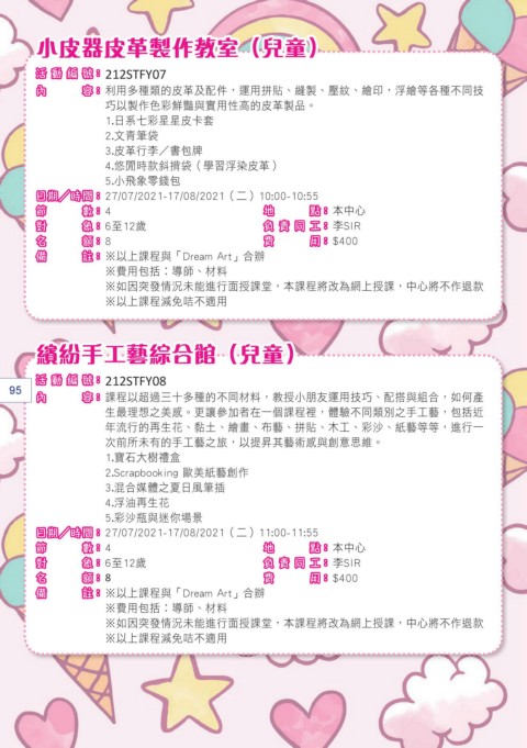 內 容 : 課程以超過三十多種的不同材料,教授小朋友運用技巧、配搭與組合,如何產