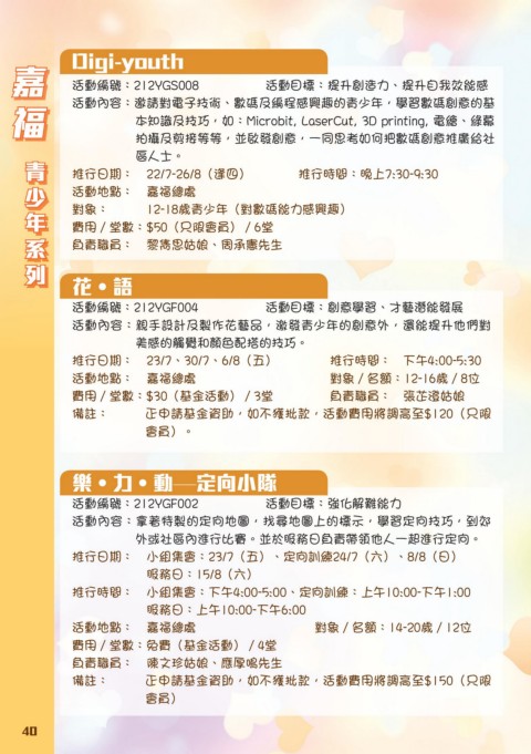 活動地點: 嘉福總處 對象∕名額:14-20歲∕12位