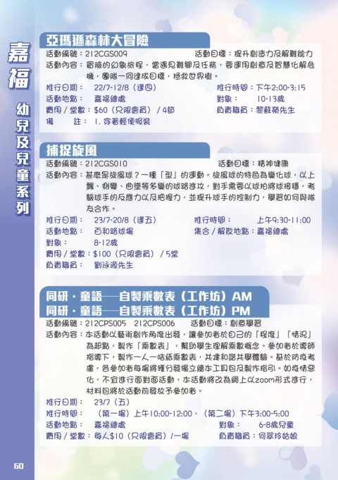 推行日期: 23/7-20/8(逢五) 推行時間: 上午9:30-11:00