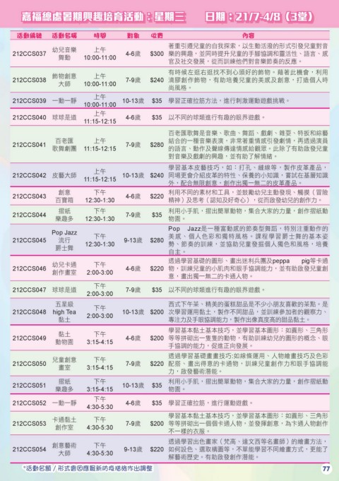 嘉福總處暑期興趣培育活動︰星期三 日期:21/7-4/8(3堂)
