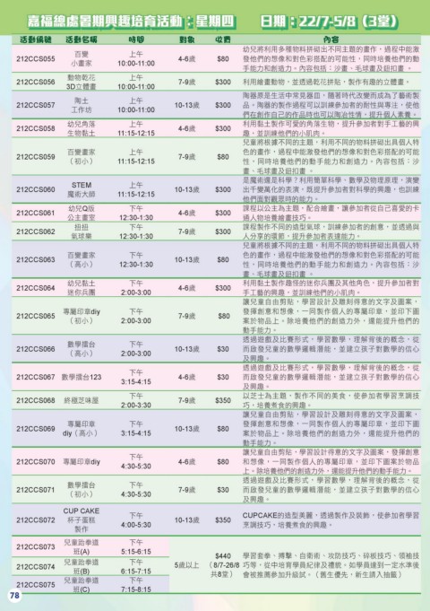 嘉福總處暑期興趣培育活動︰星期四 日期:22/7-5/8(3堂)