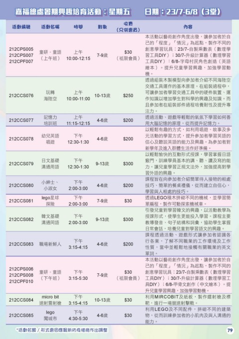 嘉福總處暑期興趣培育活動︰星期五 日期:23/7-6/8(3堂)