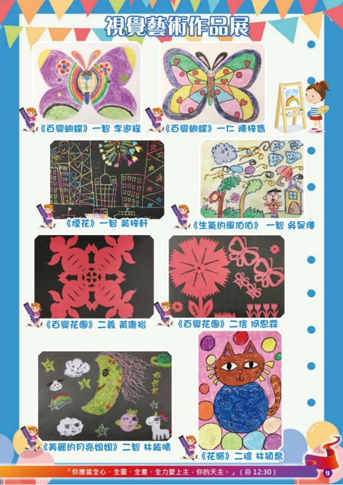 視覺藝術作品展 《百變蝴蝶》一智 李遨程 《百變蝴蝶》一仁 陳梓雋 《煙花》一智 黃梓軒 《生氣的風伯伯》 一智 吳旻燁 《百變花團》二義 黃康裕 《百變花團》二信 何思霖 《美麗的月亮姐姐》二智 林銥晴 《花貓》二禮 林潁喬 「你應當全心、全靈、全意、全力愛上主,你的天主。」(谷 12:30) 9