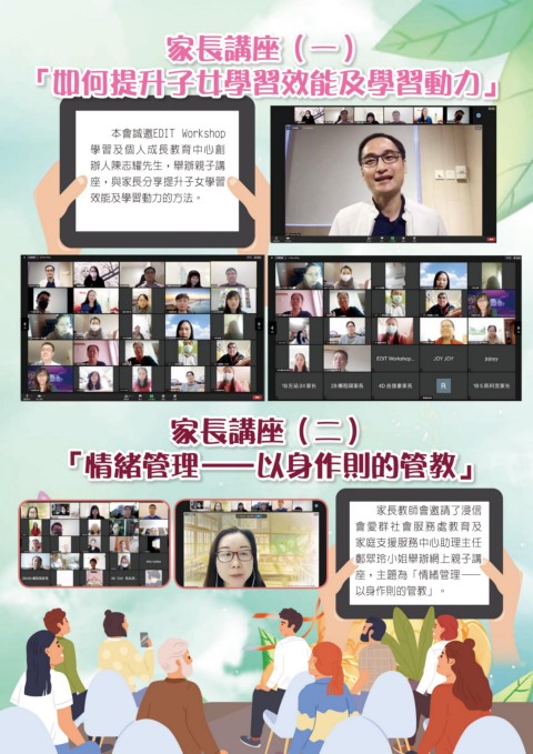 家長講座(一) 「如何提升子女學習效能及學習動力」 本會誠邀EDIT Workshop 學習及個人成長教育中心創 辦人陳志耀先生,舉辦親子講 座,與家長分享提升子女學習 效能及學習動力的方法。 家長講座(二) 「情緒管理—以身作則的管教」 家長教師會邀請了浸信 會愛群社會服務處教育及 家庭支援服務中心助理主任 鄭翠玲小姐舉辦網上親子講 座,主題為「情緒管理— 以身作則的管教」。