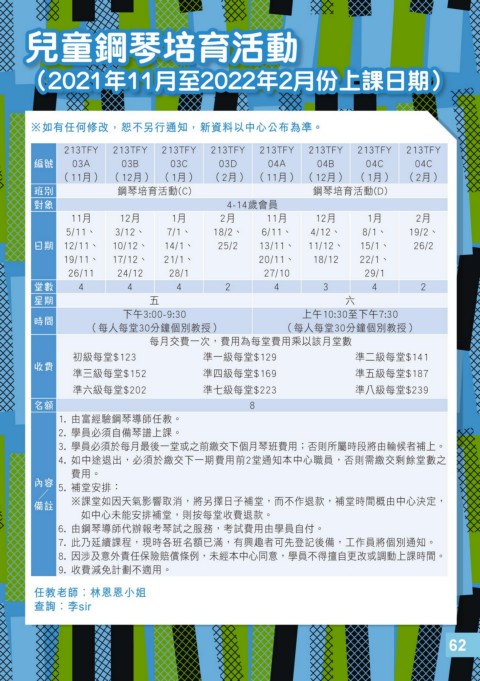 備註 ※課堂如因天氣影響取消,將另擇日子補堂,而不作退款,補堂時間概由中心決定,