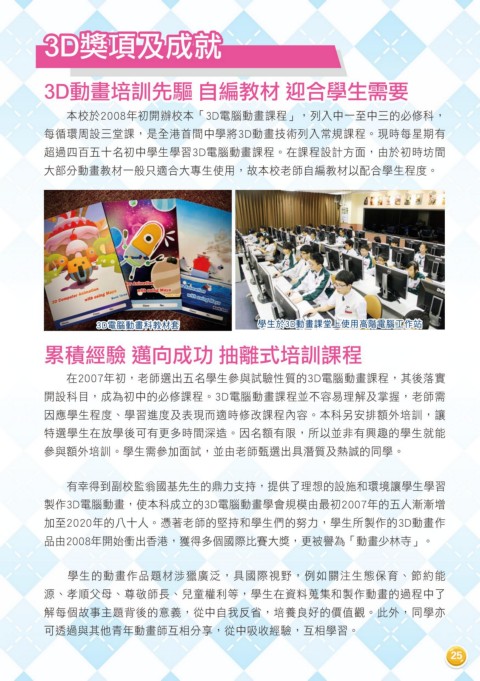 本校於2008年初開辦校本「3D電腦動畫課程」,列入中一至中三的必修科,