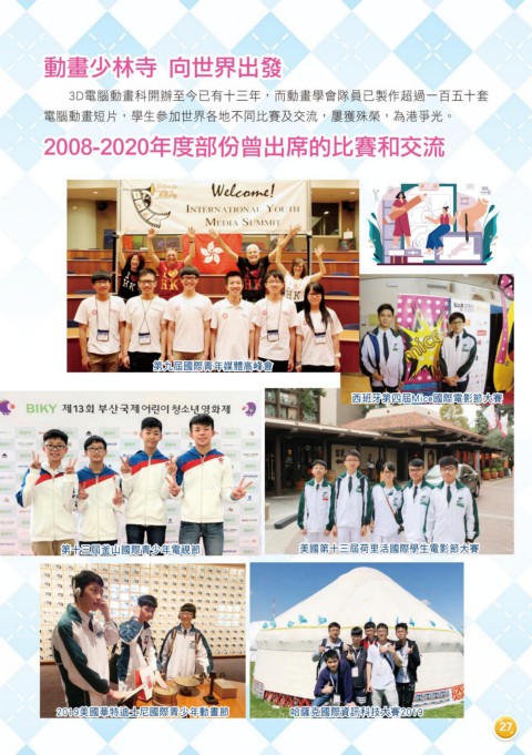 動畫少林寺 向世界出發 3D電腦動畫科開辦至今已有十三年,而動畫學會隊員已製作超過一百五十套 電腦動畫短片,學生參加世界各地不同比賽及交流,屢獲殊榮,為港爭光。 2008-2020年度部份曾出席的比賽和交流 第九屆國際青年媒體高峰會 西班牙第四屆Mice國際電影節大賽 第十三屆釜山國際青少年電視節 美國第十三屆荷里活國際學生電影節大賽 2019美國華特迪士尼國際青少年動畫節 哈薩克國際資訊科技大賽2019 27