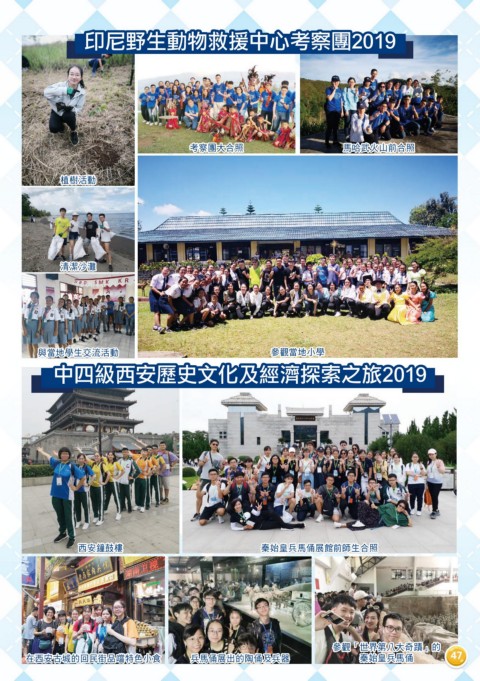 印尼野生動物救援中心考察團2019 考察團大合照 馬哈武火山前合照 植樹活動 清潔沙灘 與當地學生交流活動 參觀當地小學 中四級西安歷史文化及經濟探索之旅2019 西安鐘鼓樓 秦始皇兵馬俑展館前師生合照 參觀「世界第八大奇蹟」的 在西安古城的回民街品嚐特色小食 兵馬俑展出的陶俑及兵器 秦始皇兵馬俑 47