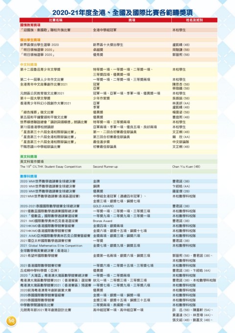 2020-21年度全港、全國及國際比賽各範疇獎項