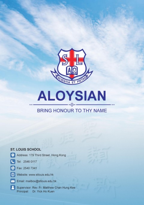 ALOYSIAN BRING HONOUR TO THY NAME ST. LOUIS SCHOOL Address: 179 Third Street, Hong Kong Tel: 2546 0117 Fax: 2540 7341 Website: www.stlouis.edu.hk Email: mailbox@stlouis.edu.hk Supervisor: Rev. Fr. Matthew Chan Hung Kee Principal: Dr. Yick Ho Kuen