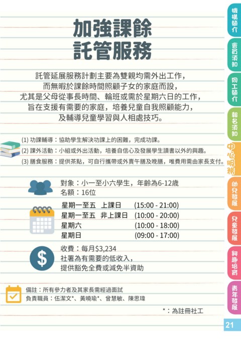 機構簡介 會員須知 同工簡介 報名須知 中心服務 幼兒發展 兒童發展 興趣培育 青年發展 21 21