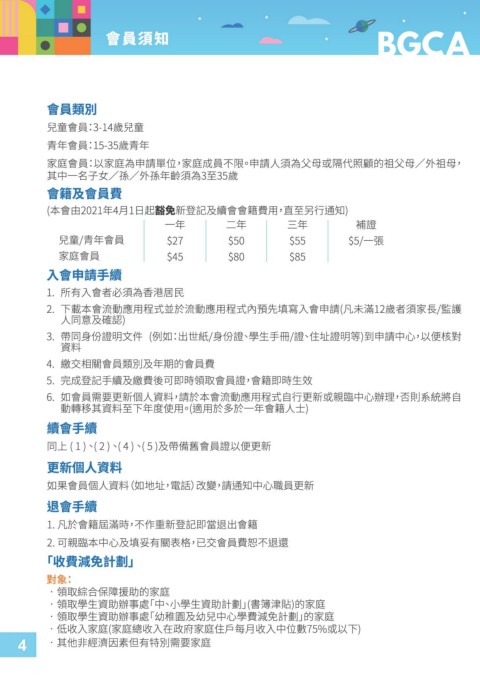 會員須知 8 4 9 「收費減免計劃」 對象: •領取綜合保障援助的家庭 •領取學生資助辦事處「中、小學生資助計劃」(書簿津貼)的家庭 •領取學生資助辦事處「幼稚園及幼兒中心學費減免計劃」的家庭•低收入家庭(家庭總收入在 政府家庭住戶每月收入中位數75%或以下) •其他非經濟因素但有特別需要家庭
