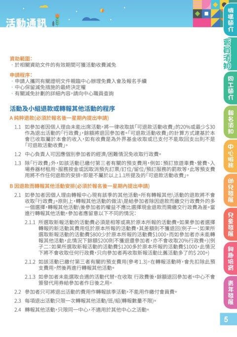 機構簡介 會員須知 會員須知 同工簡介 報名須知 中心服務 幼兒發展 兒童發展 興趣培育 青年發展 5 8 9 5 「收費減免計劃」 對象: •領取綜合保障援助的家庭 •領取學生資助辦事處「中、小學生資助計劃」(書簿津貼)的家庭 •領取學生資助辦事處「幼稚園及幼兒中心學費減免計劃」的家庭•低收入家庭(家庭總收入在 政府家庭住戶每月收入中位數75%或以下) •其他非經濟因素但有特別需要家庭