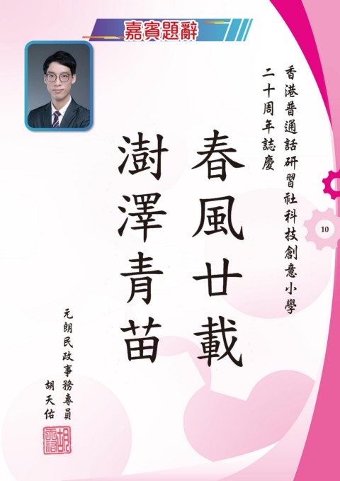 嘉賓題辭 嘉賓題辭 年 誌 慶 二 十 周 話 研 習 通 香 港 普 意 小 學 創 社 科 技 10 政 事 民 元 朗 員 專 務 天 胡 佑