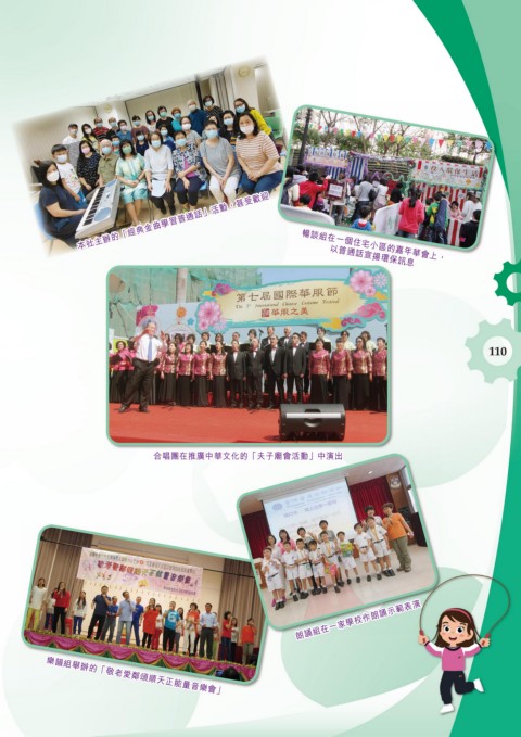 本社主辦的「經典金曲學習普通話」活動,甚受歡迎 暢談組在一個住宅小區的嘉年華會上, 本社主辦的「經典金曲學習普通話」活動,甚受歡迎 暢談組在一個住宅小區的嘉年華會上, 以普通話宣揚環保訊息 以普通話宣揚環保訊息 110 合唱團在推廣中華文化的「夫子廟會活動」中演出 合唱團在推廣中華文化的「夫子廟會活動」中演出 朗誦組在一家學校作朗誦示範表演 朗誦組在一家學校作朗誦示範表演 樂韻組舉辦的「敬老愛鄰頌順天正能量音樂會」 樂韻組舉辦的「敬老愛鄰頌順天正能量音樂會」