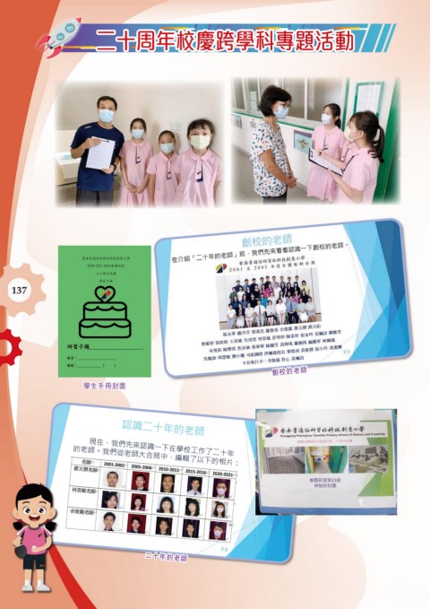 二十周年校慶跨學科專題活動 二十周年校慶跨學科專題活動 香港普通話研習社科技創意小學 2020-2021 跨科專題研習 二十周年校慶 學生手冊 137 習 題 子 研 研習子題 姓名: 姓 名 : 別 班 班別: ( ) : ) ( 創校的老師 創校的老師 學生手冊封面 學生手冊封面 認識二十年的老師 現在,我們先來認識一下在學校工作了二十年 的老師。我們從老師大合照中,編輯了以下的相片: 4C 吳卓霖 4C 吳卓霖 P.8 二十年的老師 二十年的老師
