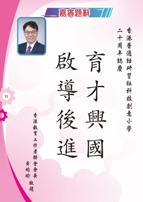 嘉賓題辭 嘉賓題辭 周 十 二 慶 誌 年 話 研 習 通 香 港 普 意 小 學 創 社 科 技 導 啟 進 後 國 育 才 興 21 育 工 作 港 香 教 者 會 長 聯 會 瑜 均 黃 題 敬