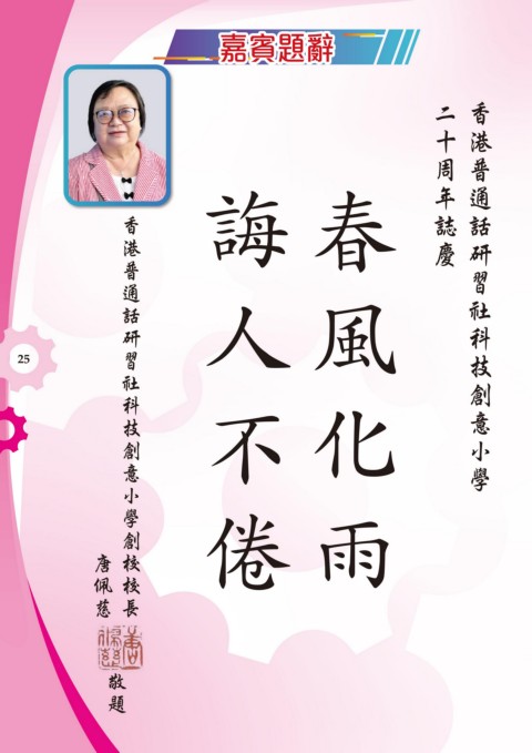 嘉賓題辭 嘉賓題辭 周 十 二 慶 誌 年 話 研 習 通 香 港 普 意 小 學 創 社 科 技 倦 誨 人 不 風 春 雨 化 習 研 社 技 科 香 港 普 話 通 校 創 長 校 意 創 學 小 25 慈 佩 唐 題 敬