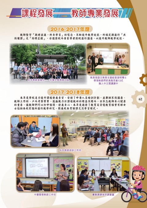 本年度學校着力提升課程發展素質,安排了中層人員培訓計劃,並舉辦不同講座、 62