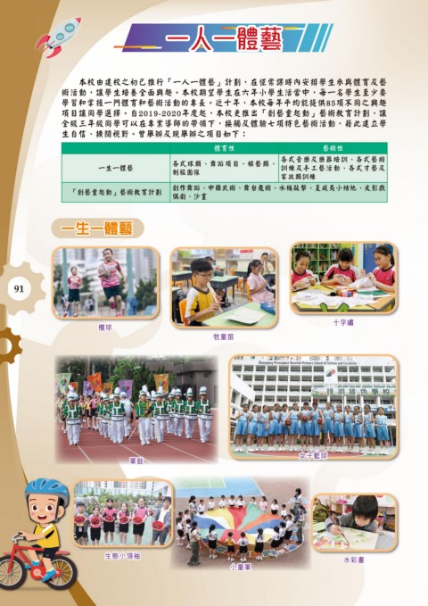 本校由建校之初已推行「一人一體藝」計劃,在恆常課時內安排學生參與體育及藝