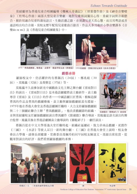 1975「曹禺戲劇節」鄭兆庭、袁報華、鄺惠華校友演《胆劍篇》                    1993莫紉蘭、蔡錫昌校友演出《山水喜相逢》