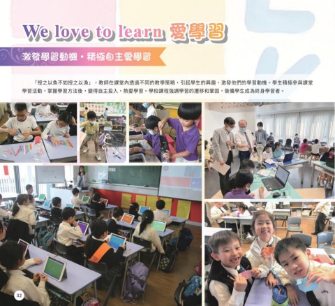 We love to learn 愛學習 激發學習動機‧積極自主愛學習 「授之以魚不如授之以漁」,教師在課堂內透過不同的教學策略,引起學生的興趣,激發他們的學習動機。學生積極參與課堂 學習活動,掌握學習方法後,變得自主投入,熱愛學習。學校課程強調學習的遷移和鞏固,裝備學生成為終身學習者。 32
