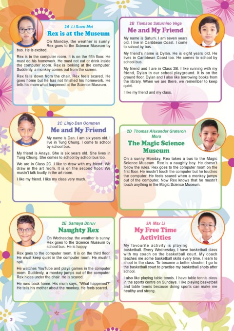 We are in Class 2C. I like to draw with my friend. We Science Museum. Rex is a naughty boy. He doesn’t