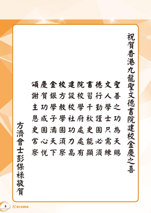 祝賀香港九龍聖文德書院建校金慶之喜 頌 慶 金 校 建 院 書 德 文 聖 謝 賀 銀 方 設 校 習 行 人 善 主 功 學 教 校 學 千 勤 學 之 恩 成 子 學 社 府 秋 謹 士 功 方濟會士彭保祿敬賀 更 固 滿 固 功 處 更 固 只 為 常 心 天 須 力 處 能 必 需 天 察 悅 下 察 高 有 顯 須 練 賜 8 50 周年金禧校慶