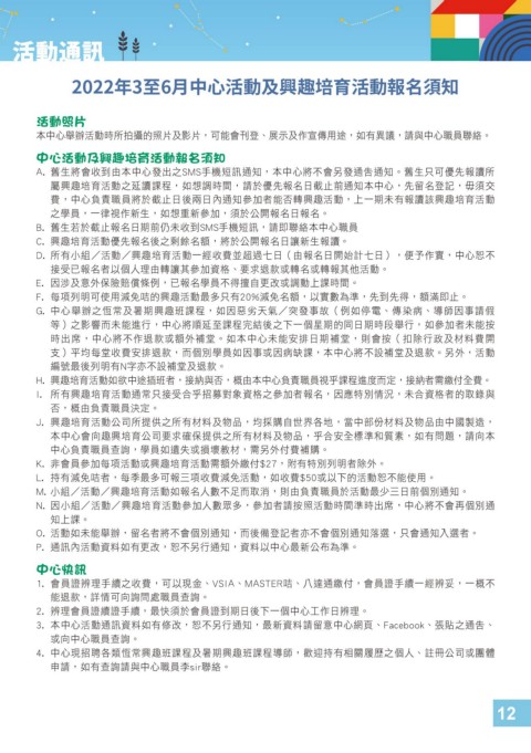2022年3至6月中心活動及興趣培育活動報名須知