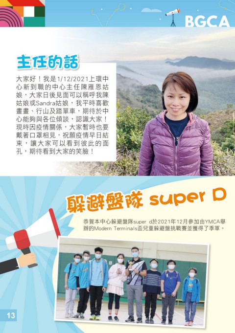 主任的話 大家好!我是1/12/2021上環中 心新到職的中心主任陳雁恩姑 娘,大家日後見面可以稱呼我陳 姑娘或Sandra姑娘,我平時喜歡 畫畫、行山及踏單車,期待於中 心能夠與各位傾談,認識大家! 現時因疫情關係,大家暫時也要 戴著口罩相見,祝願疫情早日結 束,讓大家可以看到彼此的面 孔,期待看到大家的笑臉! 躲避盤隊 super D 恭賀本中心躲避盤隊super d於2021年12月參加由YMCA舉 辦的Modern Terminals盃兒童躲避盤挑戰賽並獲得了季軍。 4 13 5