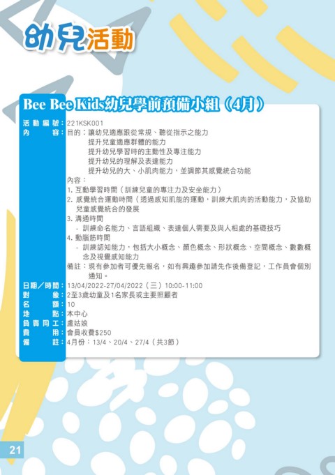 Bee Bee Kids幼兒學前預備小組(4月)