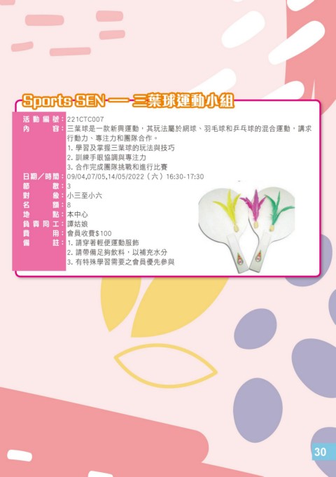 內 容 : 三葉球是一款新興運動,其玩法屬於網球、羽毛球和乒乓球的混合運動,講求