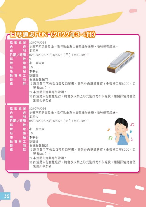 備 註 : 1) 課程費用不包括口琴及口琴書,需另外向導師購買(全音楷口琴$200,口