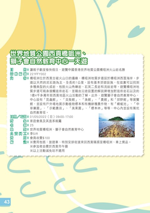 目 的 : 讓親子歡度愉快假日,遊覽中國香港世界地質公園橋咀洲火山岩名勝