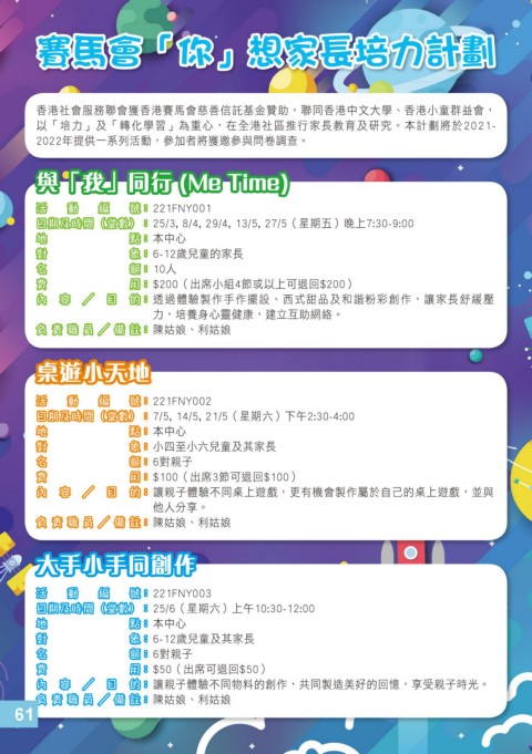 內 容 / 目 的 : 透過體驗製作手作擺設、西式甜品及和諧粉彩創作,讓家長舒緩壓