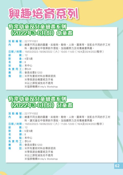日期/時間: 19/03/2022-18/06/2022(六)10:00-11:00(16/4及30/4/2022暫停)