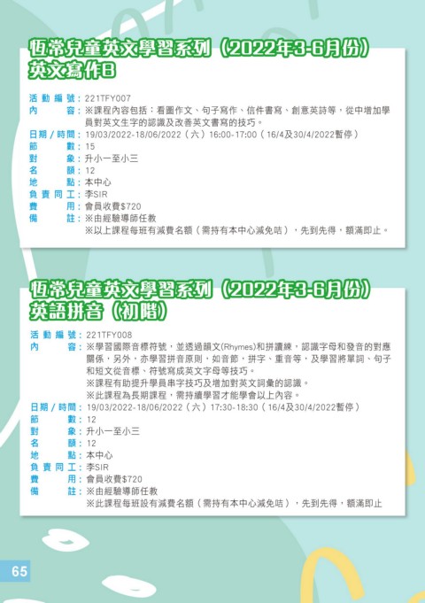 ※以上課程每班有減費名額(需持有本中心減免咭),先到先得,額滿即止。