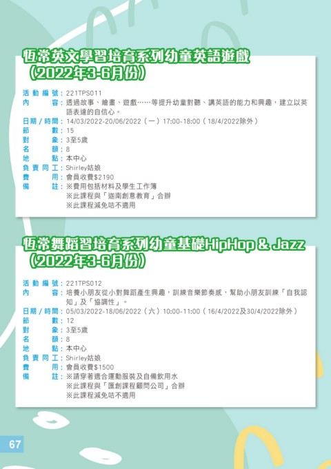 日期/時間: 14/03/2022-20/06/2022(一)17:00-18:00(18/4/2022除外)
