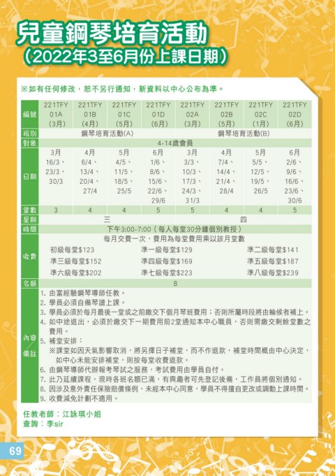 備註 ※課堂如因天氣影響取消,將另擇日子補堂,而不作退款,補堂時間概由中心決定,