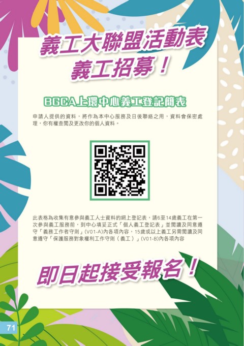 義工大聯盟活動表 義工招募! BGCA上環中心義工登記簡表 申請人提供的資料,將作為本中心服務及日後聯絡之用,資料會保密處 理,你有權查閱及更改你的個人資料。 此表格為收集有意參與義工人士資料的網上登記表,請6至14歲義工在第一 次參與義工服務前,到中心填妥正式「個人義工登記表」並閱讀及同意遵 守「義務工作者守則」(V01-A)內各項內容,15歲或以上義工另需閱讀及同 意遵守「保護服務對象權利工作守則(義工)」(V01-B)內各項內容 即日起接受報名! 71