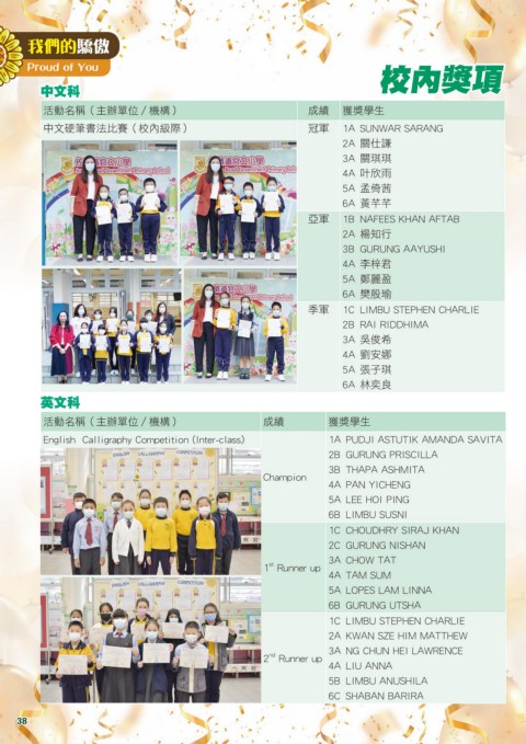 中文硬筆書法比賽(校內級際) 冠軍 1A SUNWAR SARANG