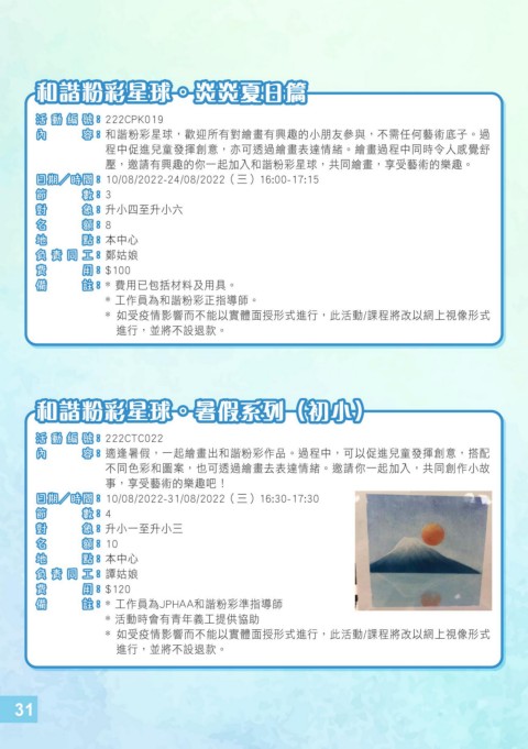 內 容 內 容 : : 適逢暑假,一起繪畫出和諧粉彩作品。過程中,可以促進兒童發揮創意,搭配