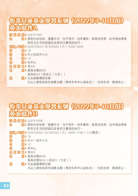 ※以上課程每班有減費名額(需持有本中心減免咭),先到先得,額滿即止。