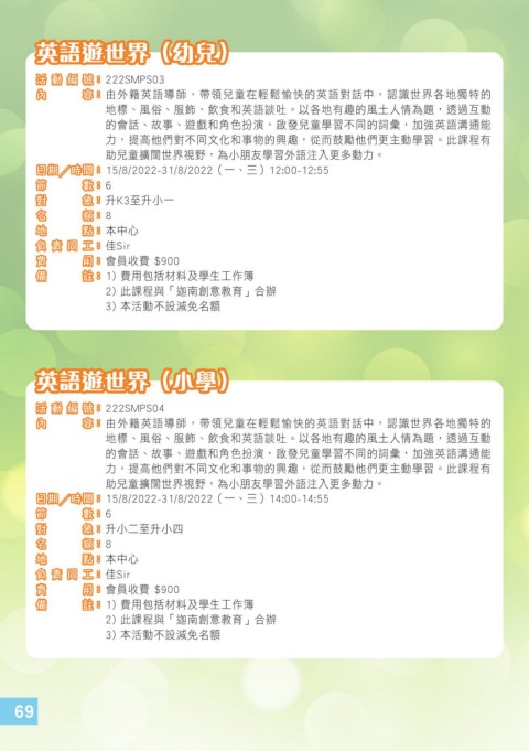 日期/時間: 15/8/2022-31/8/2022(一、三)14:00-14:55