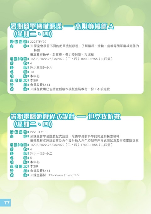 備 註 備 註 : : ※課程費用已包括童創積木機械套裝教材一份,不設退款