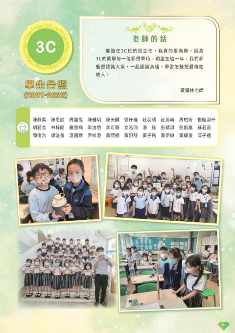 老師的話 3C 能擔任3C班的班主任,我真的很高興,因為 3C的同學每一位都很乖巧。期望在這一年,我們都 能更認識大家,一起認識真理,學習怎樣把愛傳給 他人! 學生合照 (2021-2022) 黃耀林老師 陳靜柔 陳恩欣 周嘉悅 陳雅玥 陳天麒 張仟曈 莊羽晴 莊蕊萌 周柏炘 崔睦羽仟 胡若言 林梓朗 羅堃楠 梁浩然 李可頤 文若同 潘 鈺 彭靖淇 彭凱嵐 蘇若菡 譚俊浩 譚沚善 温國斌 尹梓澄 黃熙桐 黃姸舒 黃子銘 黃伊琳 黃耀俊 邱子禮 83