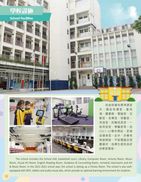 The school includes the School Hall, basketball court, Library, Computer Room, Activity Room, Music