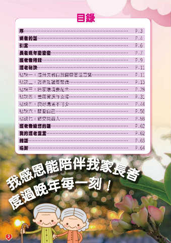 目錄 序 P.3 編者的話 P.4 引言 P.6 長者晚年變變變 P.7 護老者階段 P.9 護老秘訣 P.11 P.11 P.13 P.28 P.31 P.44 P.50 P.58 護老者給您的話 P.62 我的護老宣言 P.62 結語 P.63 鳴謝 P.64 我感恩能陪伴我家長者 度過晚年每一刻! 2