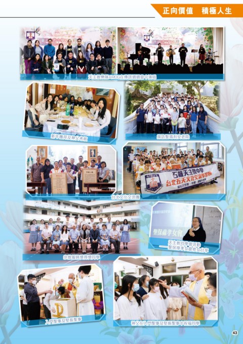 正向價值 積極人生 天主教樂隊AMDG在傳訊週週會中演唱 天主教樂隊AMDG在傳訊週週會中演唱 探訪聖瑪利安老院 探訪聖瑪利安老院 新年團拜及神父考核 新年團拜及神父考核 台北文化交流團 台北文化交流團 天主教同學會活動 天主教同學會活動 —聖保祿孝女會修女分享 —聖保祿孝女會修女分享 宗教服務獎得獎同學 宗教服務獎得獎同學 入門聖事及堅振聖事 入門聖事及堅振聖事 神父在入門聖事及堅振聖事中祝福同學 神父在入門聖事及堅振聖事中祝福同學 43 43
